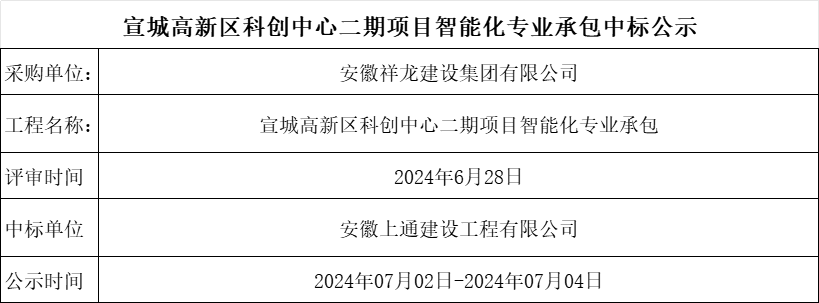 宣城高新區科創中心二期項目智能化專業承包中標公示