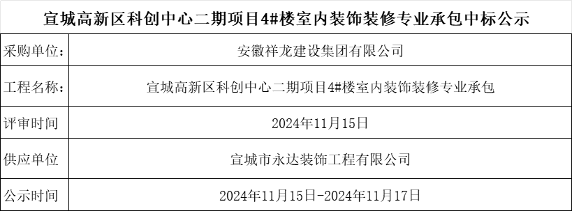 宣城高新區科創中心二期項目4#樓室內裝飾裝修專業承包中標公示