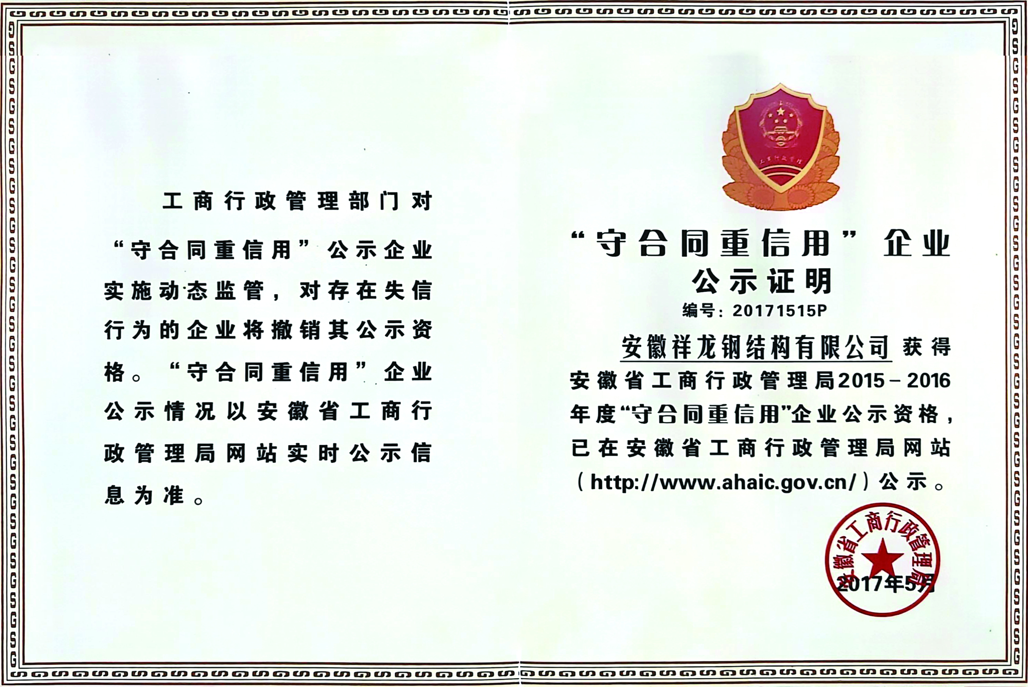 守合同重信用企業(yè)公示證書